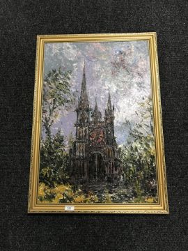 Twentieth century school : A Cathedral exterior, oil on board, 50 cm x 74.5 cm, framed.