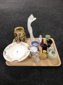A tray of Doulton figure, Indian pattern vase, blue and white cups, nine miniature Japanese vases