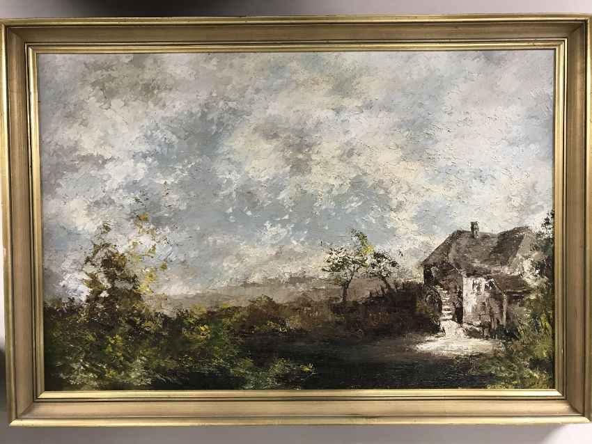 Twentieth century school : Study of a watermill, oil on board, 59 cm x 89 cm, framed.