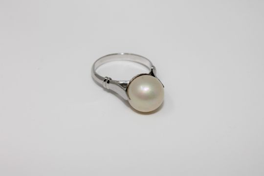 A large pearl ring, the 11mm pearl set in white metal with foreign marks to outside of shank, possibly platinum
