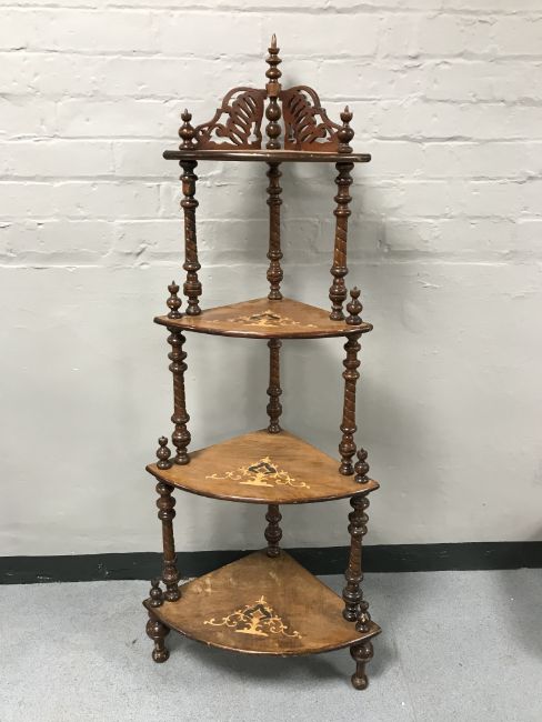 A Victorian inlaid rosewood four tier corner what not stand
