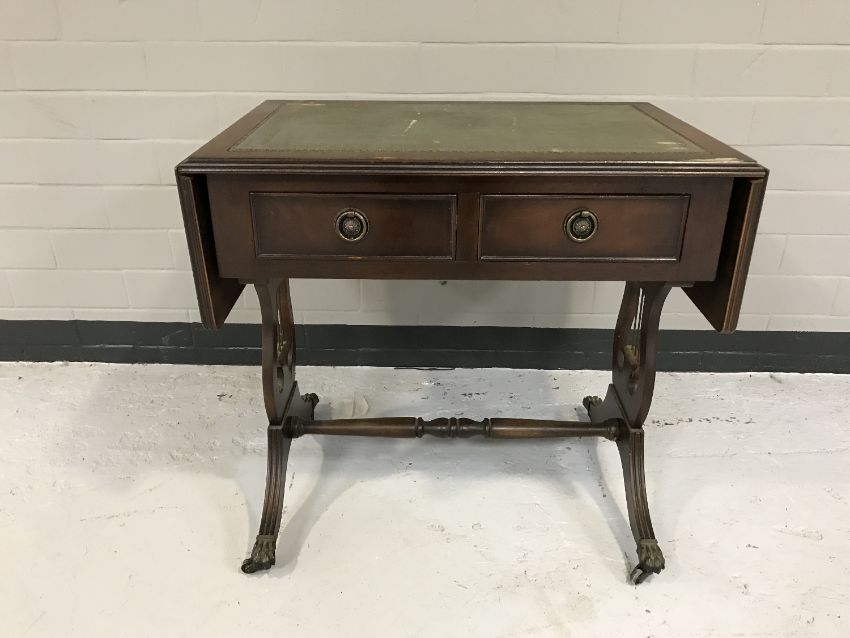 A mahogany leather topped drop end sofa coffee table fitted with two drawers
