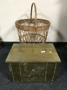 A brass embossed coal box with liner together with a wicker log basket