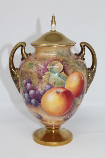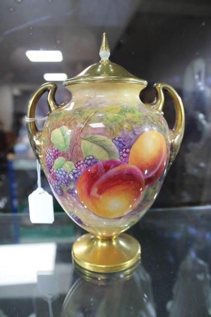 A Royal Worcester gilded lidded urn decorated with panels of fruit and berries, signed J. Skerrett, the base numbered 2701, black base stamp, height 21cm