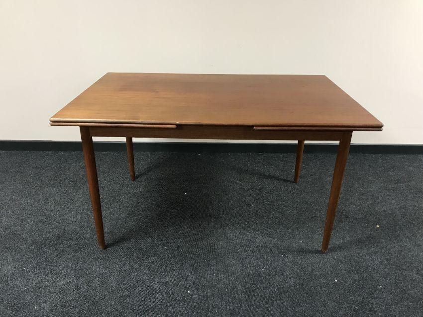 This measures 140cm long, 88cm deep and 76cm high. This is a pull-out table with an extending leaf at either end. Each leaf would add 54cm in length. Due to where the table is situated in the saleroom I am unable to take a picture of it extended. There table surface has typical scuffs and scratches, as well as some watermarks. The legs have numerous nicks and dents. There is cosmetic wear but overall the table is in good condition.