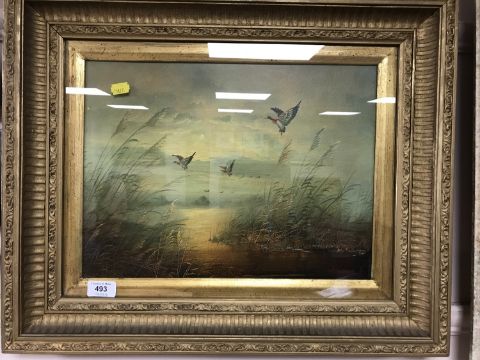Nineteenth century school : Flighting ducks, oil on canvas, 39 cm x 29 cm, indistinctly signed, framed.