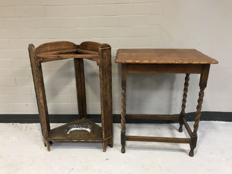 An oak barley twist occasional table together with a pine corner stick stand with tray