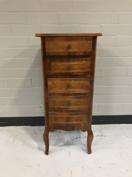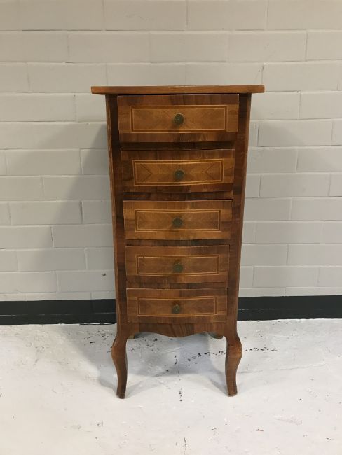 A narrow inlaid mahogany five drawer chest