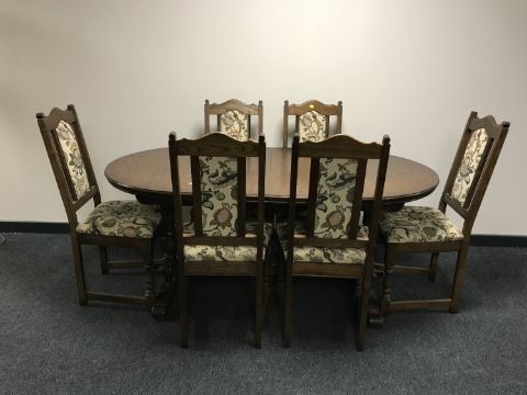 A Priory oak oval extending dining table with leaf and six single chairs