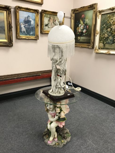 A Juliana Collection figured table lamp with glass shade and a flower fairy lamp table