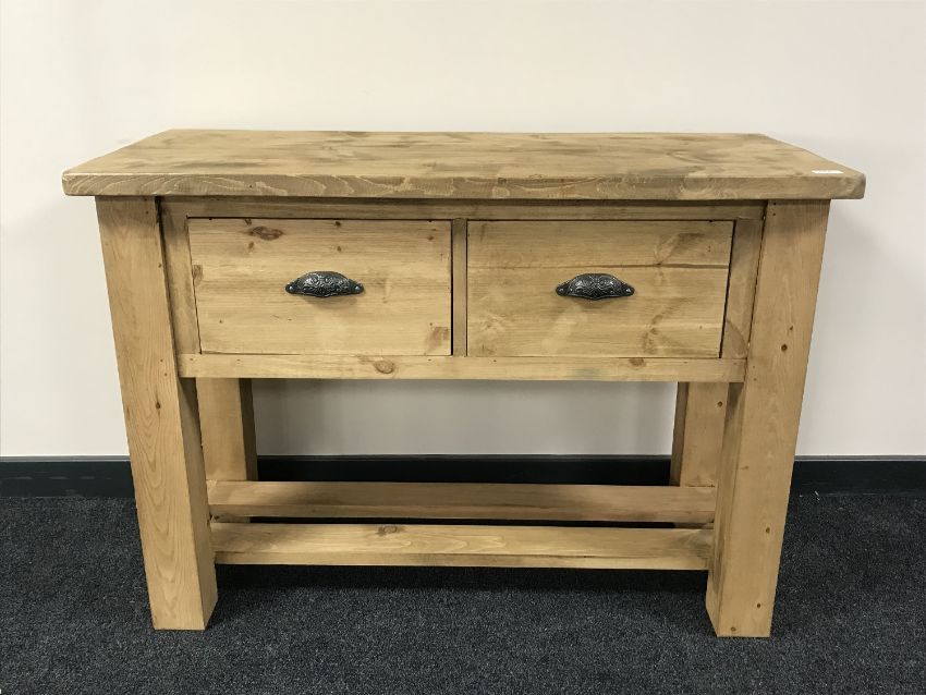 A reclaimed pine kitchen preparation table fitted two drawers
