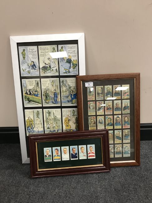 A framed set of Recruit cigarette card reprints, together with Rugby Internationals and ten French souvenir cards, all parts framed. (3)