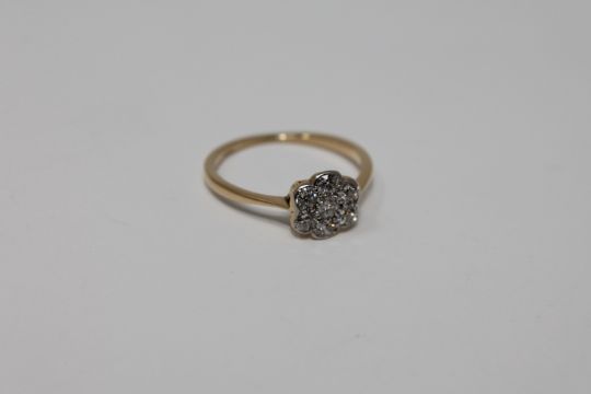 The ring is in good condition. It is set with 7 old cut diamonds in an illusion setting. The ring is size M and weighs 1.9g. The hallmarks are worn but it tests as 18ct gold. Total diamond weight estimated at 0.15 carat.