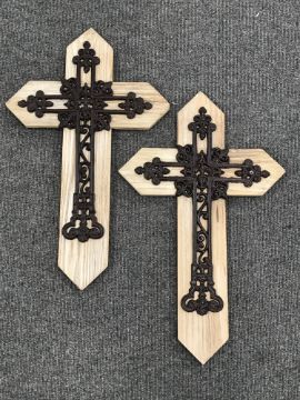 A set of six cast metal crosses mounted on boards