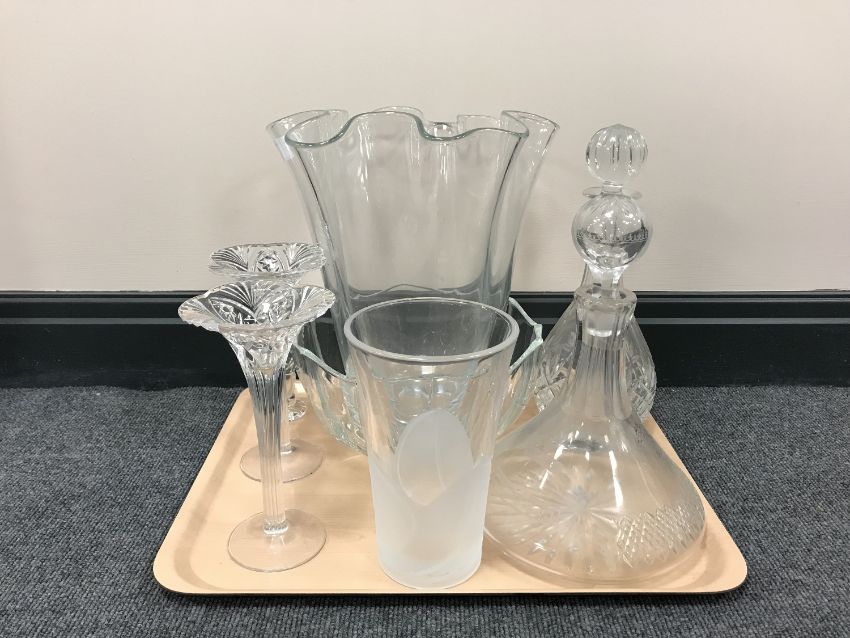 A tray of pair of cut glass candle holders, decanters, large envelope vase etc