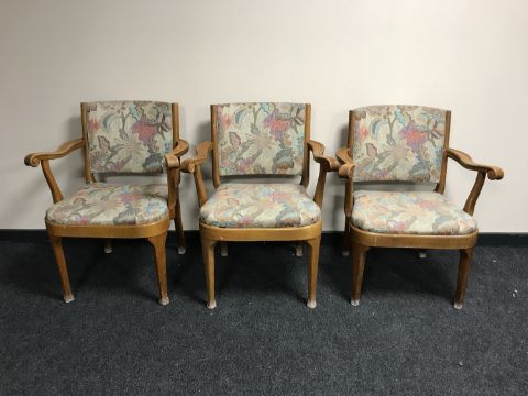 A set of three walnut scroll arm, armchairs, upholstered in a multi coloured fabric