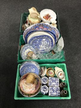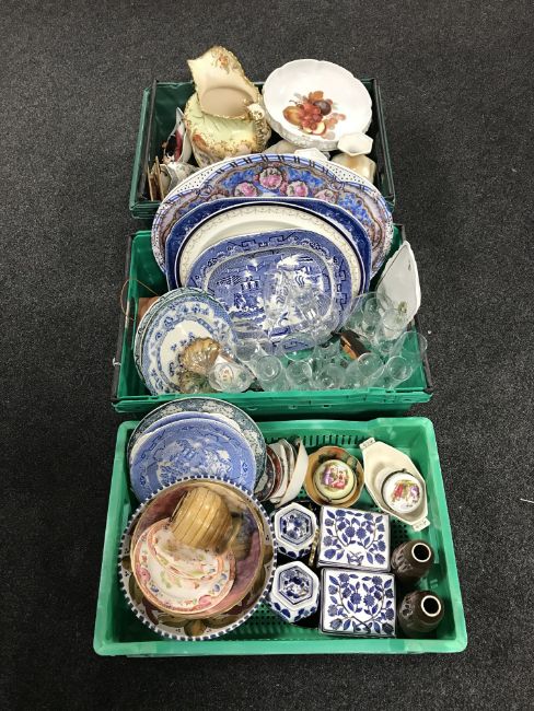 Three boxes of blue and white ashettes, china and assorted glass ware etc
