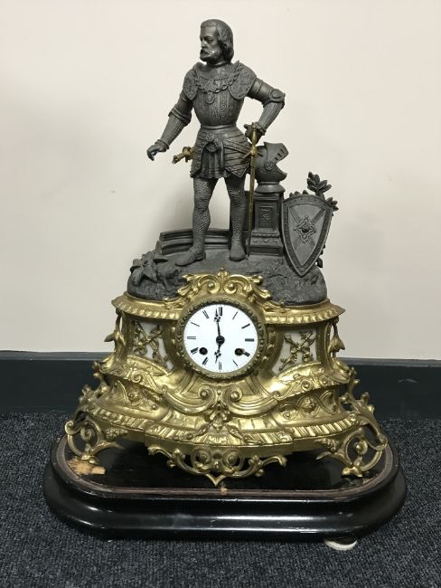 A French brass and spelter mantel clock with enamelled dial on wooden plinth