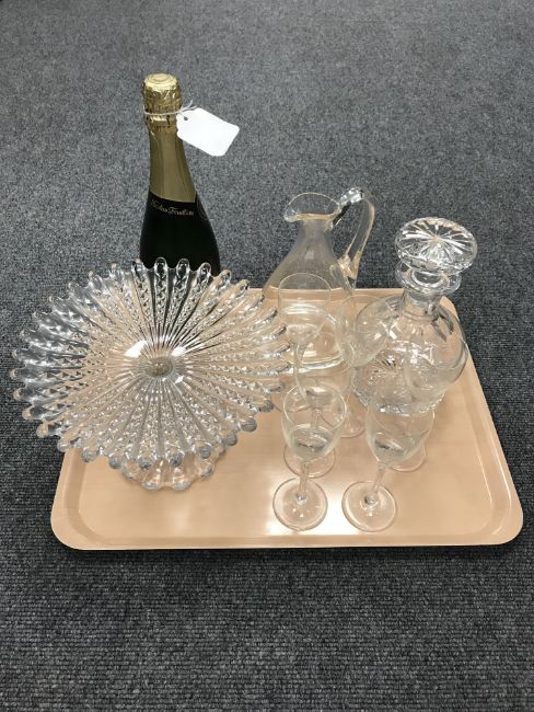 A tray of crystal decanter, glass ware together with a bottle of Nicolas Feuillatte champagne