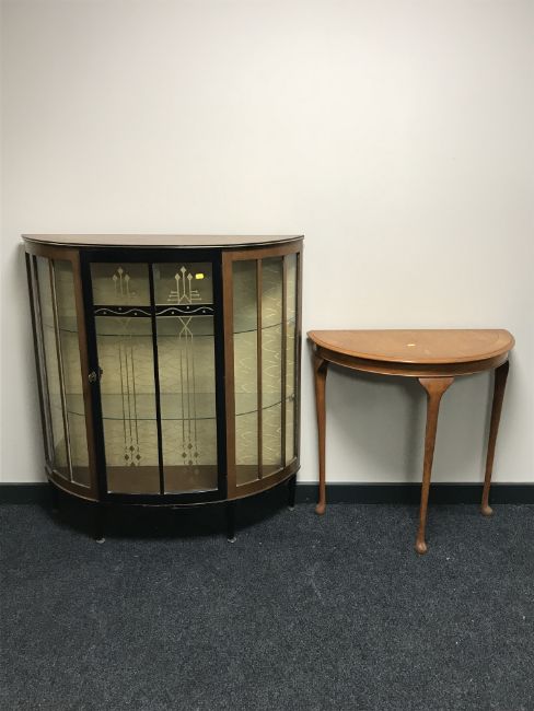 A mid 20th century teak D shaped display cabinet, together with a inlaid yew wood hall table