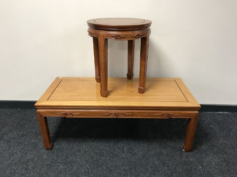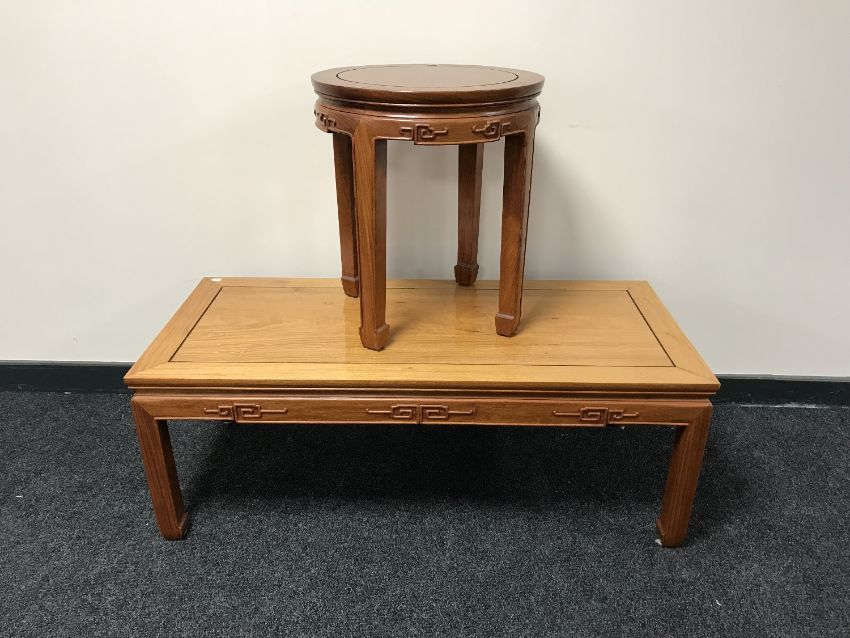 An oriental style rectangular hardwood coffee table together with circular lamp table