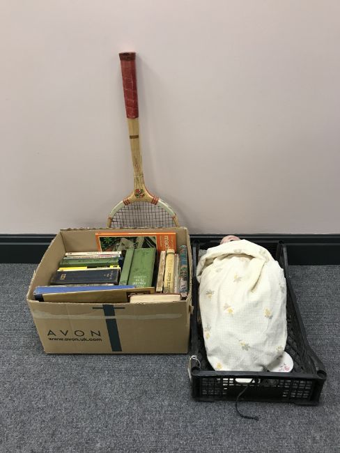 A box containing books, novels, etc . Together with a bisque headed doll, a dolls tea service and a vintage tennis racket