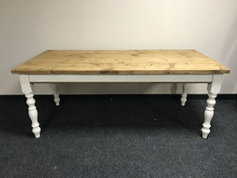 A reclaimed pine farmhouse table on painted legs