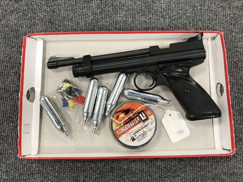 A Crosman .22 calibre air pistol with gas capsules and pellets
