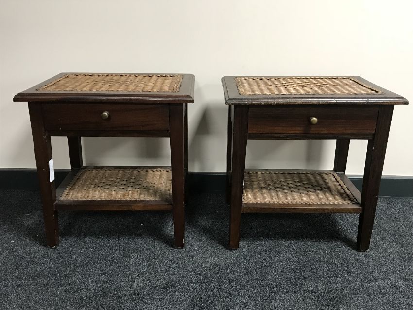 A pair of wicker topped two tier bedside tables, fitted a drawer