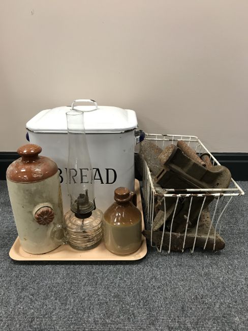 A tray of enamelled bread bin, two stone ware bottles, glass oil lamp and a basket of cobbler's lasts and flat irons