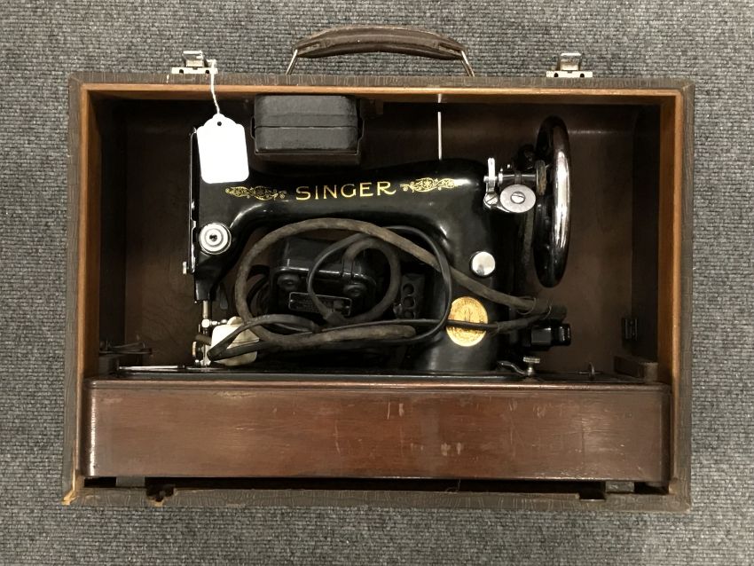 A cased Singer electric sewing machine