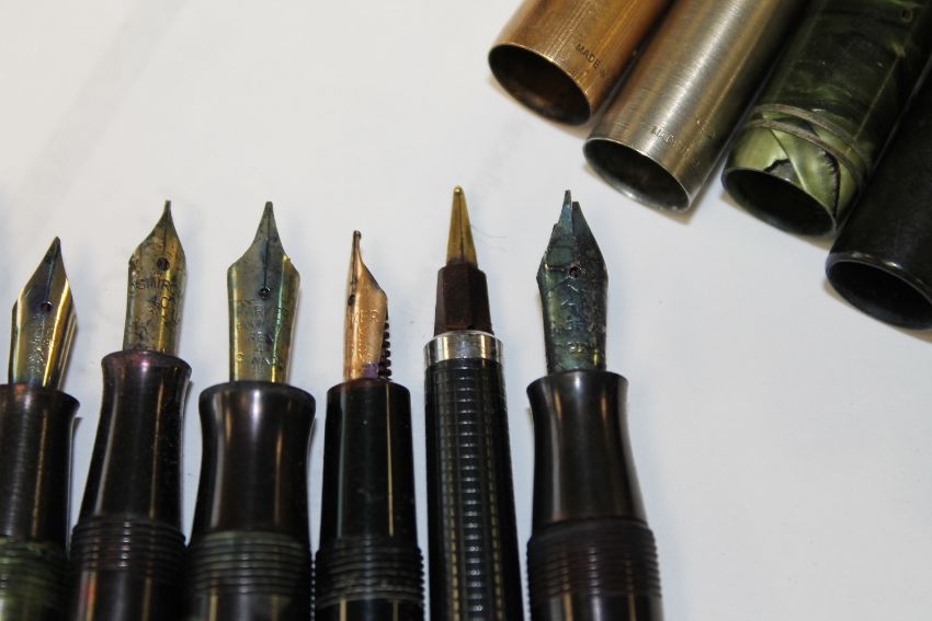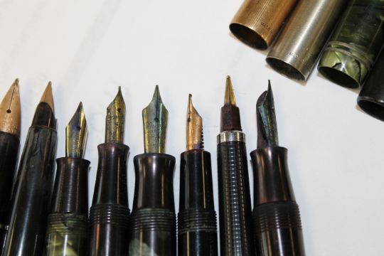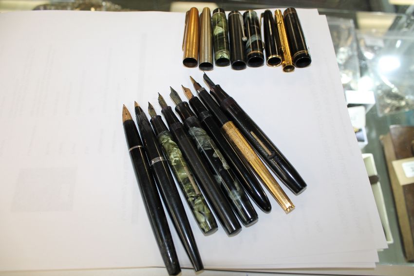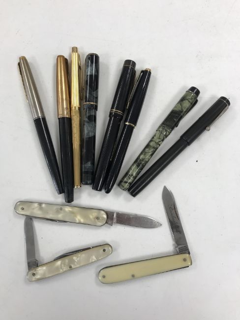 A collection of Parker and other pens, several with gold nibs, together with three pen knives and a quantity of pre decimal and decimal British coinage