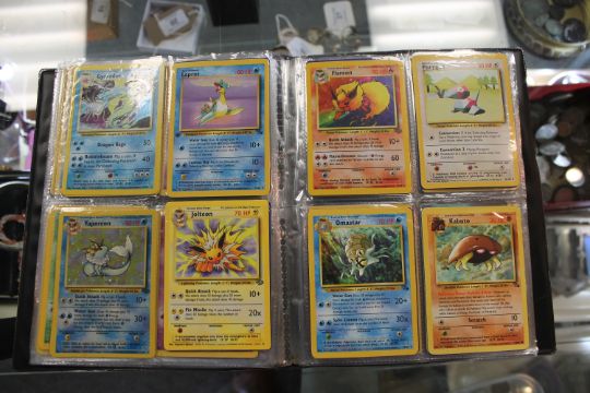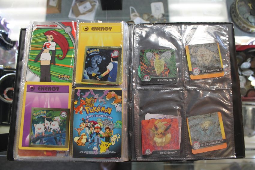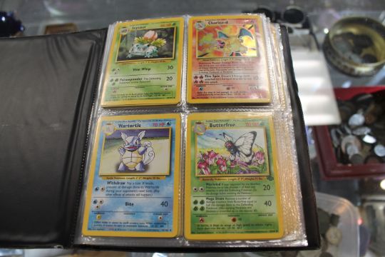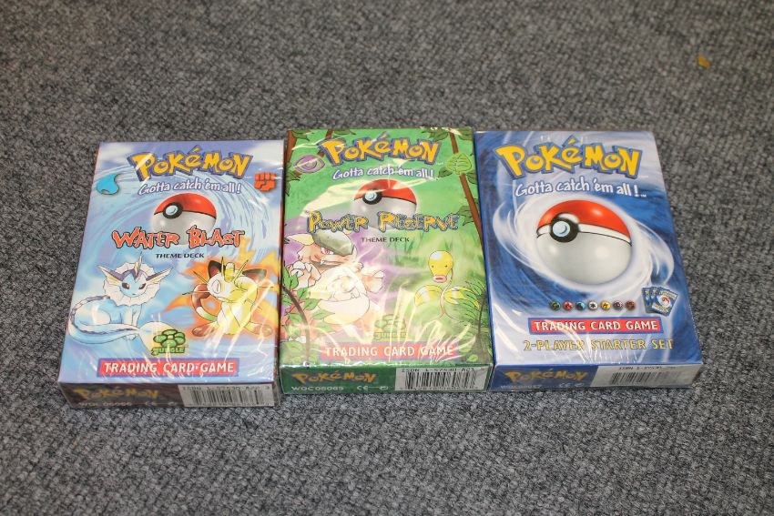 A basket containing a Pokemon trading card folder with cards, six boxed sets of Pokemon cards and four boxed Pokemon power balls