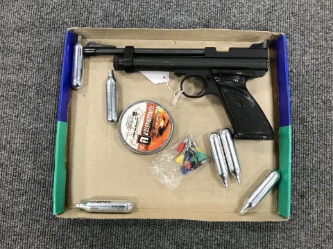 A Crosman .22 calibre air pistol with gas capsules and pellets