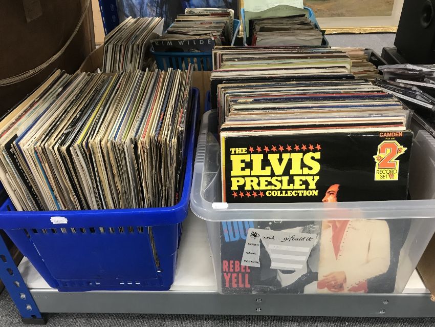 Three boxes of LP records including rock, Elvis etc