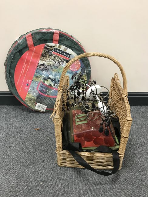 A garden tidy bag together with a wicker log basket, a light fitting, a propagator and two folding bar stools