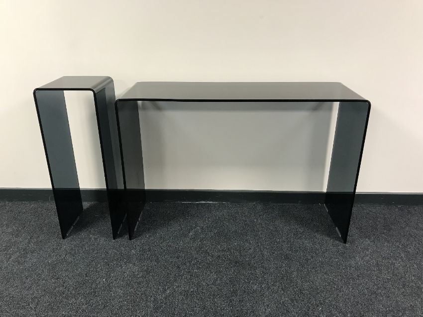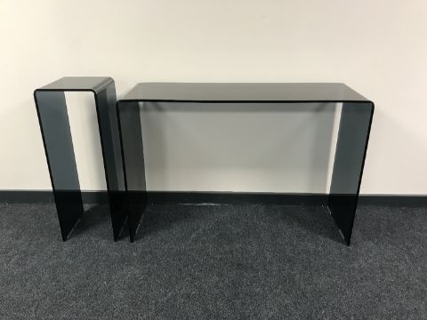 A contemporary black glass console table together with matching plant stand