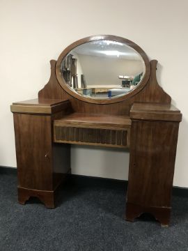 An early 20th century mahogany kneehole dressing table with pillar cabinet supports and an oval mirror