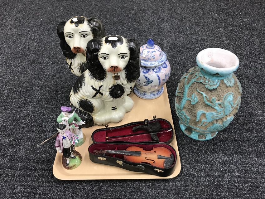 A tray containing a pair of Staffordshire style dogs, an Italian pottery vase, a pair of continental figurines, a miniature violin and bow in case etc