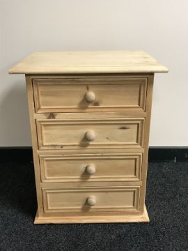 An unfinished reclaimed pine four drawer bedside chest