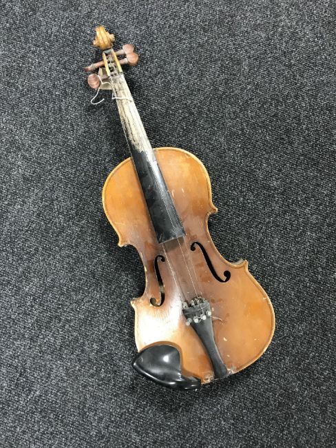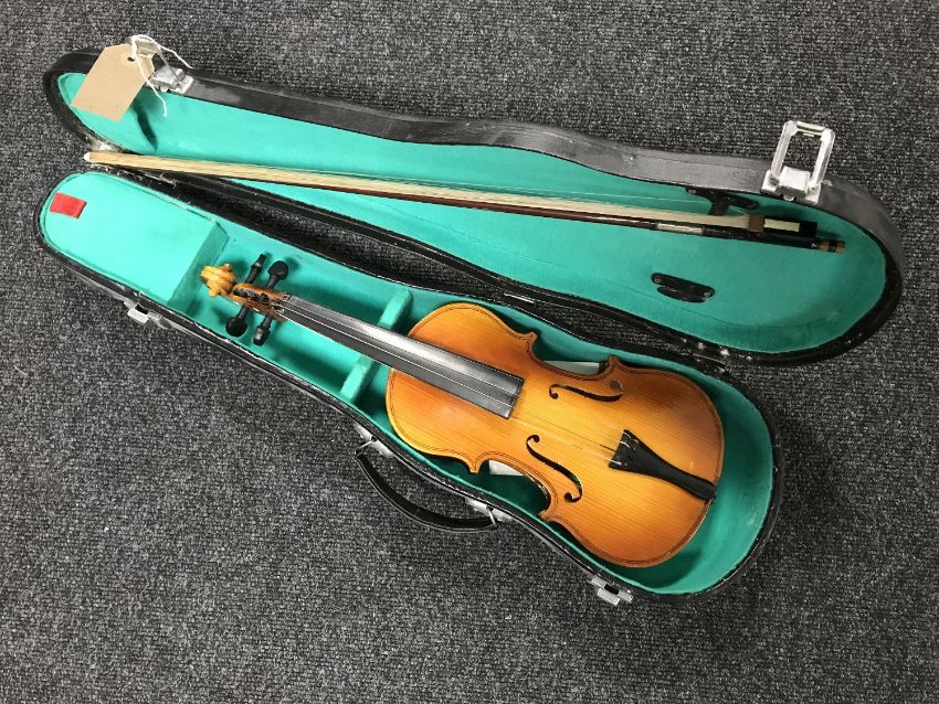 A Chinese Lark violin and bow in case with a Chinese Lark violin