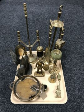 A tray of two brass companion sets, brass and onyx candle holder, brass figure, etc