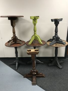 Four wooden circular bar tables on pedestals, together with three further odd pedestals