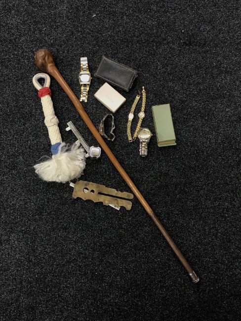 A box of gent's wrist watches, medal boxes, brass military button cleaner, rope bell pull and a shillelagh