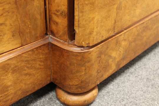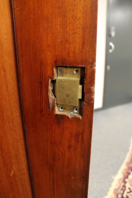 Right side door missing carved pediment. Other small scuffs and veneer losses. Middle door lockplate is loose. See additional images.