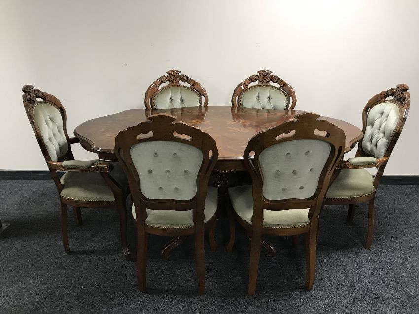 A shaped Italianate pedestal dining table with six chairs comprising of two carvers and four singles