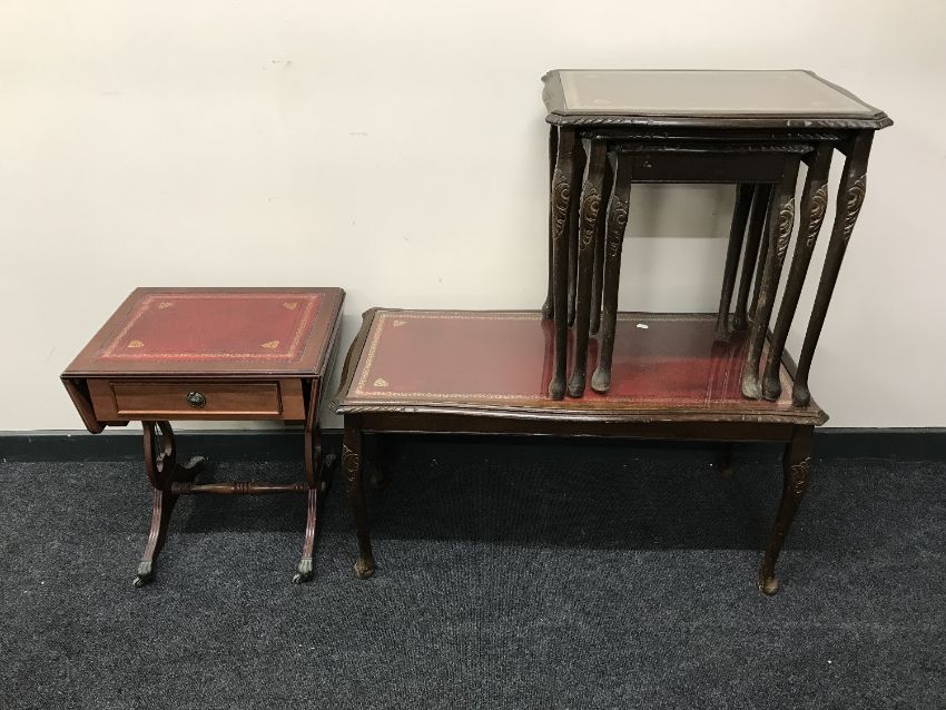 A mahogany red leather glass topped coffee table together with matching nest of three tables and a mahogany red leather topped sofa table