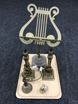 A tray containing an adjustable brass music stand, a pair of brass Corinthian column table lamps, together with a vintage brass weight and a hand bell