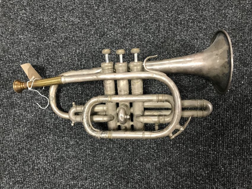A chrome Barratts bugle and a 20th century violin in hard case