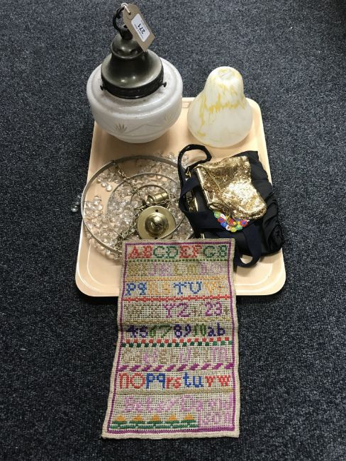 A tray containing a unframed sampler, two ladies purses, a hanging ceiling light with glass drops, together with two vintage opaque light shades, one with fitting